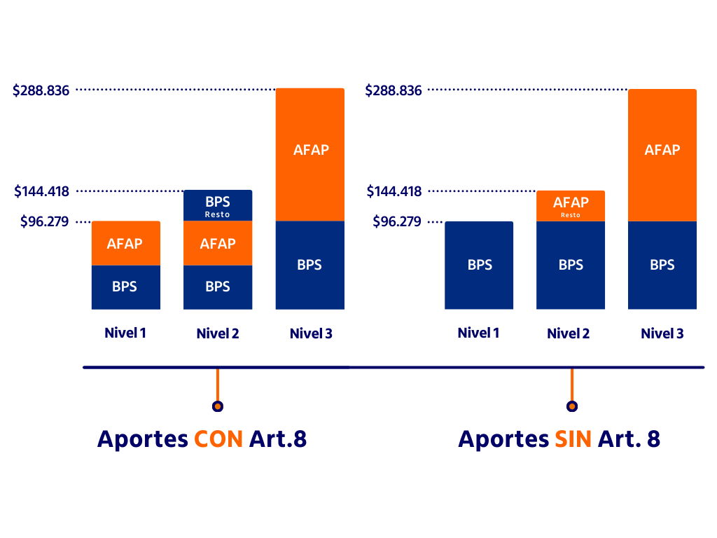 Si un trabajador, tiene un sueldo por encima de la segunda franja, los aportes jubilatorios se dividirían de la misma forma, tenga o no tenga marcado el artículo 8, es decir, por la primera franja aportaría el 15% al BPS y por el resto del sueldo hasta el tope, aportaría el 15% a la AFAP. Del mismo modo que teniendo marcada la opción del articulo 8, si un trabajador tiene un sueldo nominal superior al tope, por encima de la tercera franja no realizará aportes jubilatorios3.